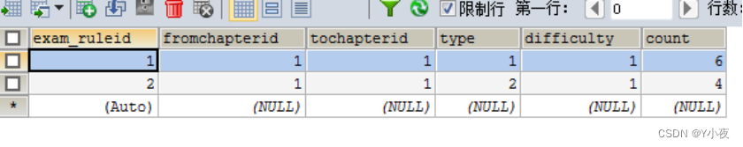CREATE TABLE `exam_rule` ( `exam_ruleid` int(11) NOT NULL AUTO_INCREMENT, `fromchapterid` int(11) DEFAULT NULL, `tochapterid` int(11) DEFAULT NULL, `type` int(11) DEFAULT NULL, `difficulty` int(11) DEFAULT NULL, `count` int(11) DEFAULT NULL, PRIMARY KEY (`exam_ruleid`) ) ENGINE=InnoDB AUTO_INCREMENT=3 DEFAULT CHARSET=utf8;