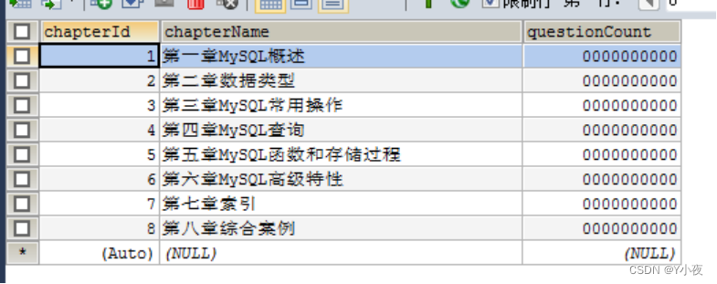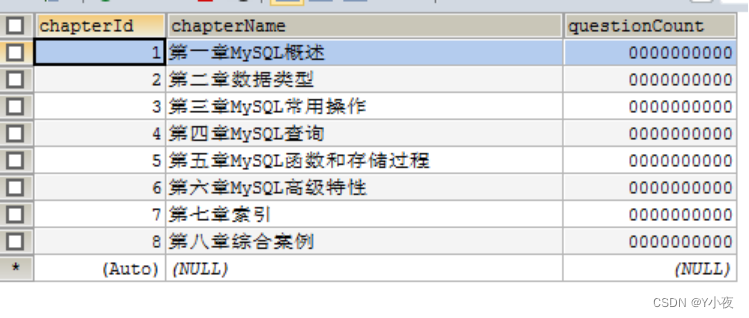 insert into `chapter`(`chapterId`,`chapterName`,`questionCount`) values (1,'第一章MySQL概述',0000000000),(2,'第二章数据类型',0000000000),(3,'第三章MySQL常用操作',0000000000),(4,'第四章MySQL查询',0000000000),(5,'第五章MySQL函数和存储过程',0000000000),(6,'第六章MySQL高级特性',0000000000),(7,'第七章索引',0000000000),(8,'第八章综合案例',0000000000);