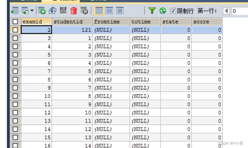 CREATE TABLE `exam` ( `examid` int(11) NOT NULL AUTO_INCREMENT, `studentid` int(11) DEFAULT NULL, `fromtime` datetime DEFAULT NULL, `totime` datetime DEFAULT NULL, `state` int(11) DEFAULT NULL, `score` int(11) DEFAULT NULL, PRIMARY KEY (`examid`) ) ENGINE=InnoDB AUTO_INCREMENT=122 DEFAULT CHARSET=utf8;