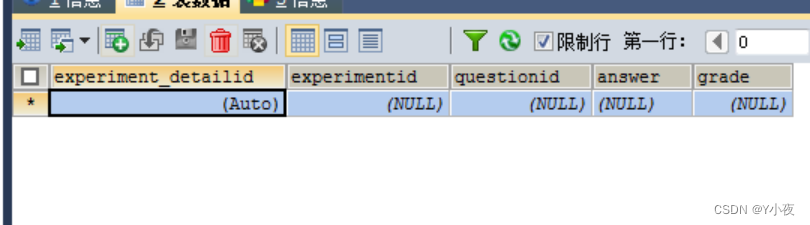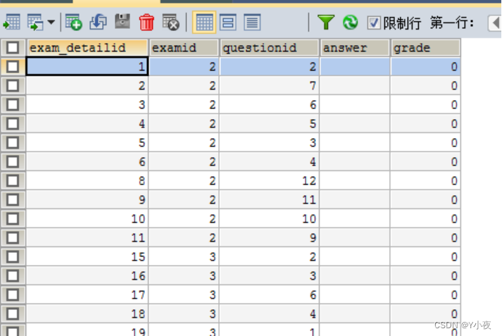 CREATE TABLE `exam_detail` ( `exam_detailid` int(11) NOT NULL AUTO_INCREMENT, `examid` int(11) DEFAULT NULL, `questionid` int(11) DEFAULT NULL, `answer` varchar(2000) DEFAULT NULL, `grade` int(11) DEFAULT NULL, PRIMARY KEY (`exam_detailid`) ) ENGINE=InnoDB AUTO_INCREMENT=1681 DEFAULT CHARSET=utf8;