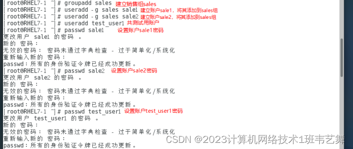 使用groupadd 命令添加 sales 组,然后执行 useradd 命令和 passwd 命令添加销售部员工的账户及密码。此处单独增加一个 test_userl 账户,不属于 sales 组,供测试用。