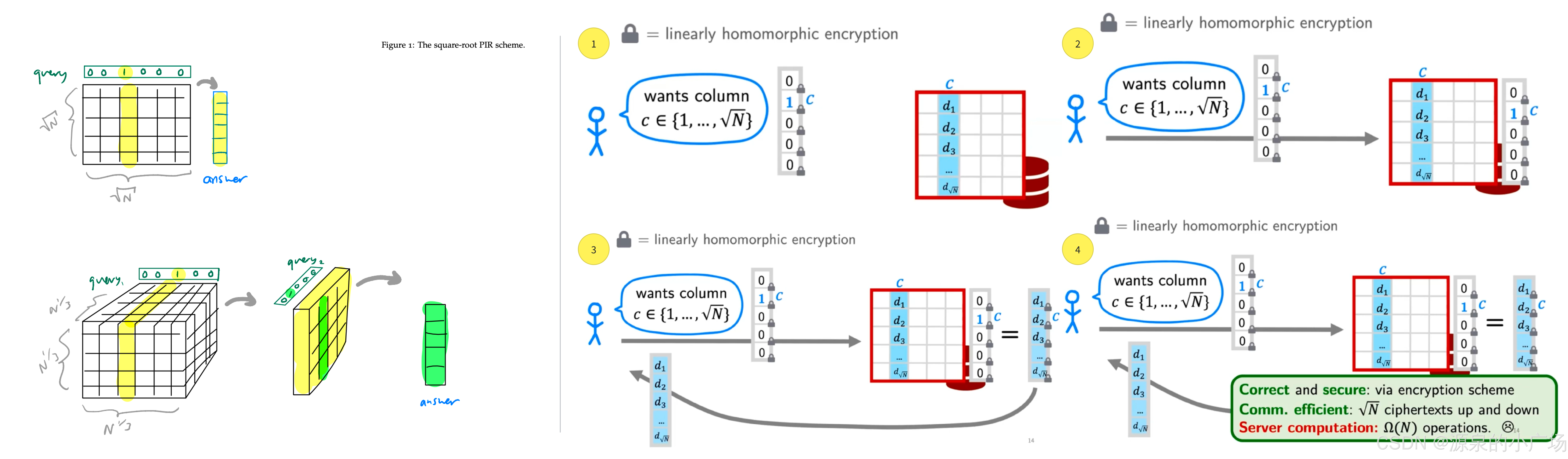 这里的“Square-root” single-server PIR,其实是【4】提出的方案,可以理解为是一种简单的基于同态加密的匿踪查询方案,服务端原始数据有N,通过平方根,转换为边长的多维矩阵的形式,这样客户端发送的密文大小就只需要