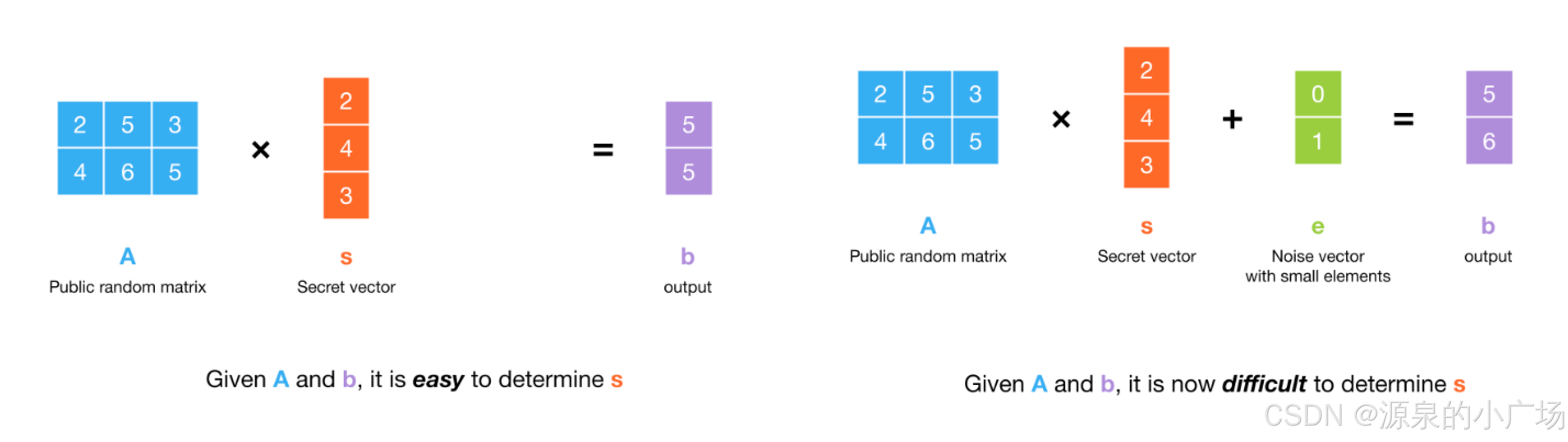 参考【6】中信息进行相应介绍。图6给出LWE示例,这个问题被称为“Learning with Error”或LWE,试图在数据中含有误差的情况下学习向量𝑠。输出的每一行可以称为一个“LWE样本”,因为它是向量𝐴的一行与𝑠的点积的噪声“观察值”。因此,误差也常被称为“噪声”,它所采样的分布称为“噪声分布”。挑战在于从最多𝑚个LWE样本中确定𝑠。