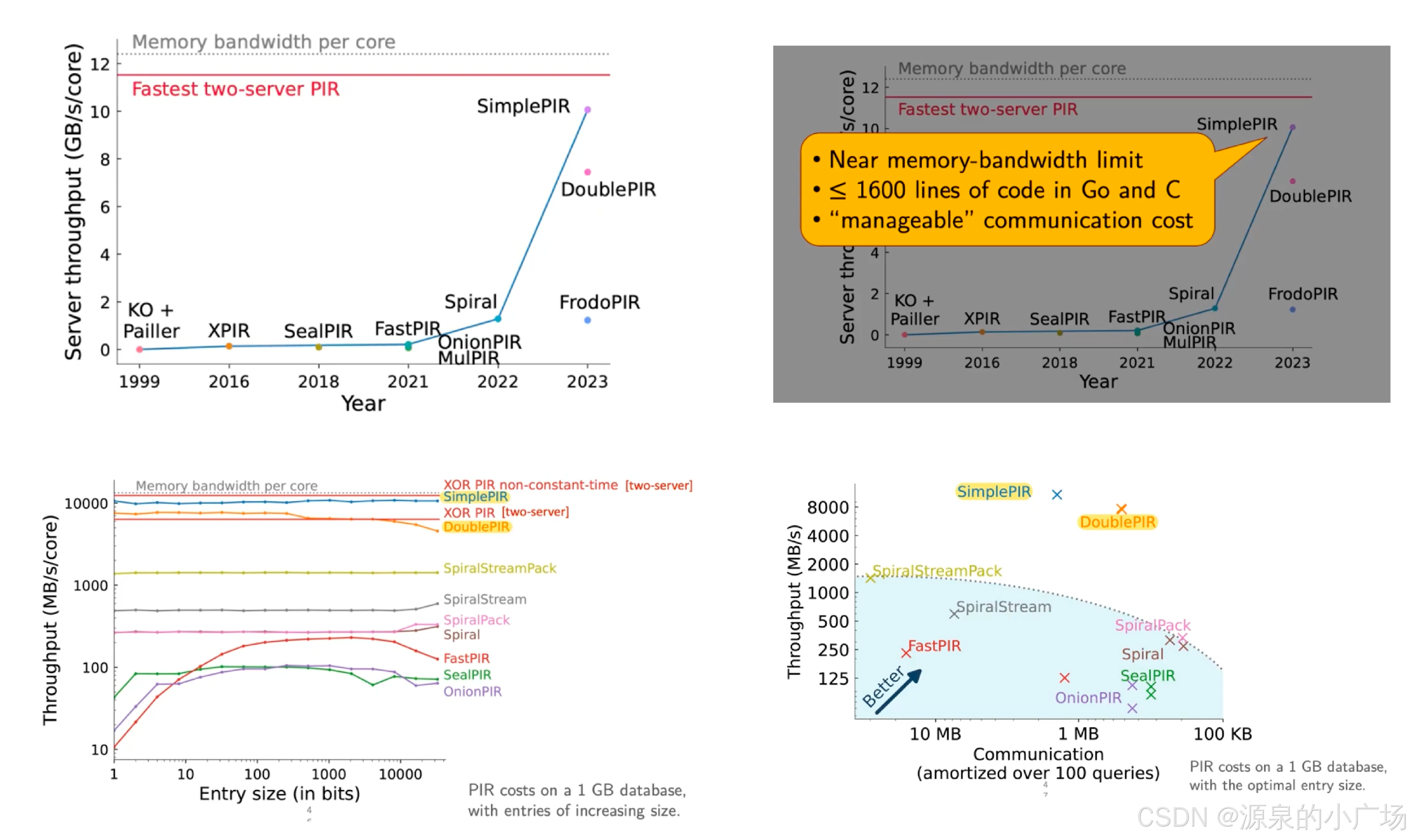 先来看下该算法的性能表现,性能好才值得深入。可以看到,Simple PIR直接将匿踪查询的生产性能门槛打掉了,服务端吞吐量(处理性能)基本接近最快的two-server PIR,而且在通信消耗上也是能接受的,如果是对通信量要求高的场景,可以采用DoublePIR,虽然服务端处理性能大概会比SimplePIR少1/3左右,但是通信消耗基本与SealPIR相当,且服务端处理性能是SealPIR的近60倍【1,2】。