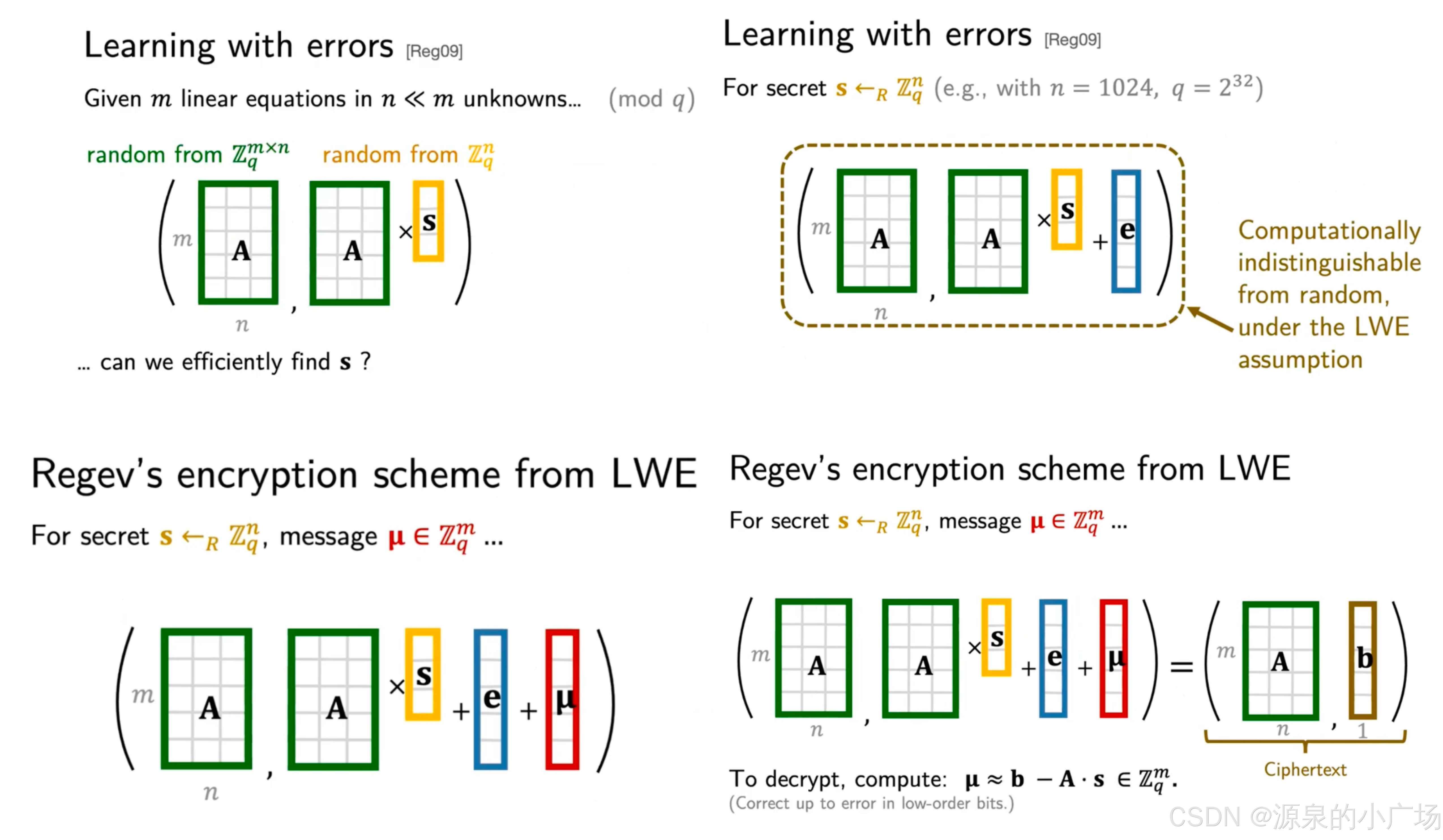 - 加密过程:消息通过与公钥矩阵进行矩阵计算,并加入随机误差来加密。解密过程则利用私钥和一个简单的矩阵运算来去除误差,从而恢复消息。