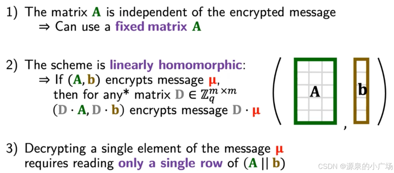 要用秘密密钥𝑠解密密文(𝐴,𝑐),我们可以计算𝑐−𝐴𝑠,并得到: