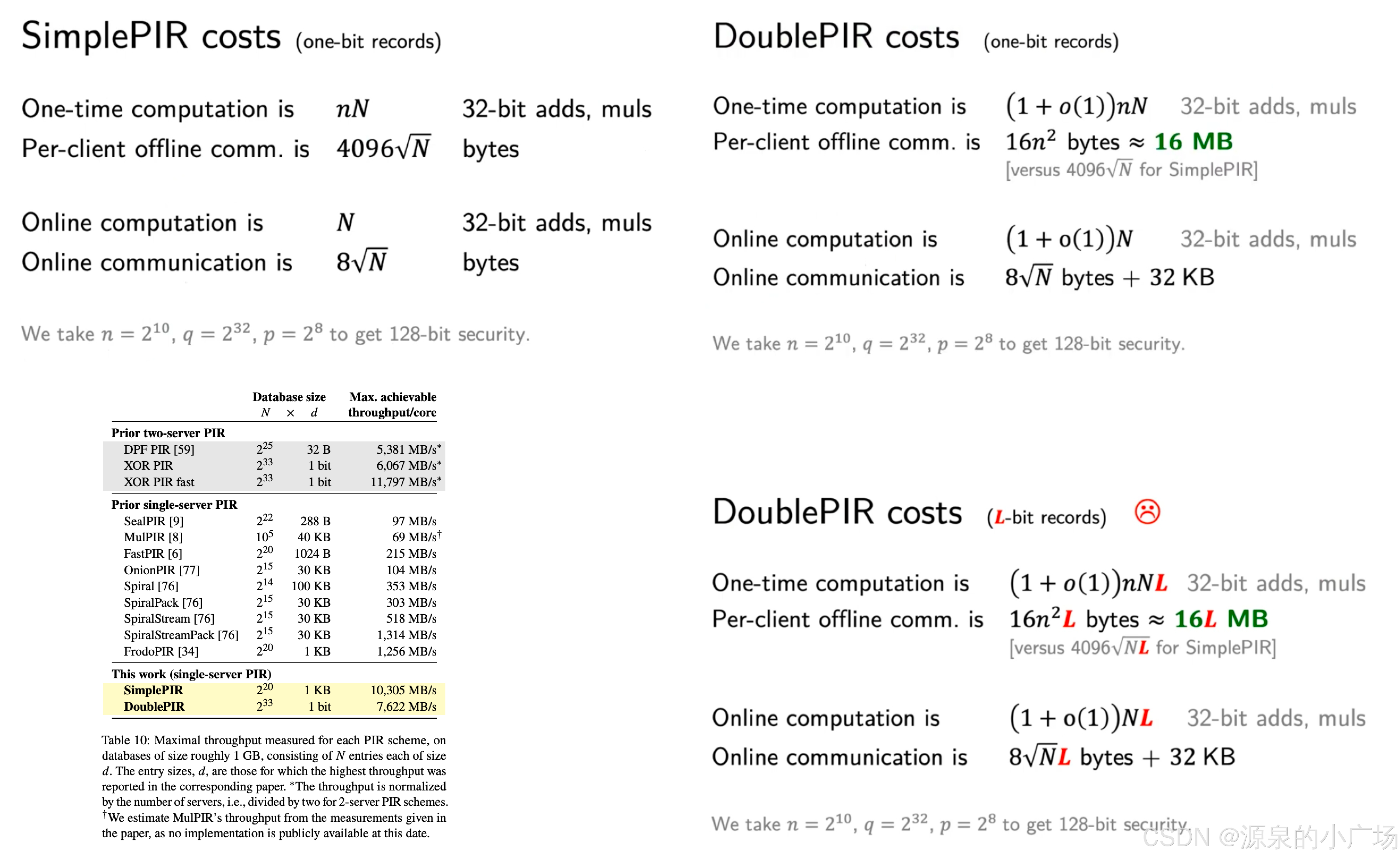 图2. SimplePIR&DoublePIR在离线阶段与在线阶段的计算与通信消耗