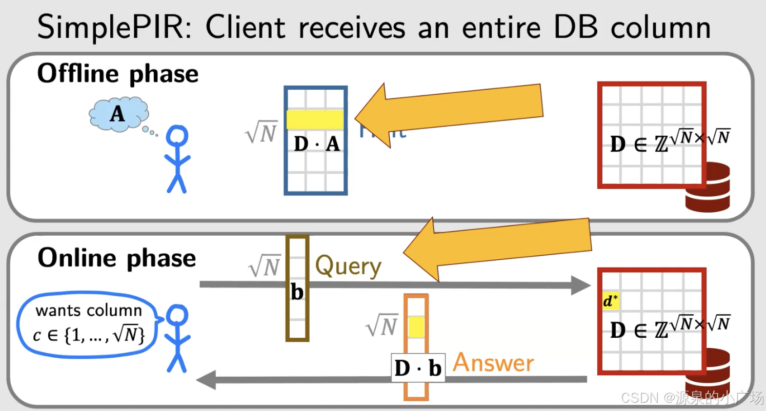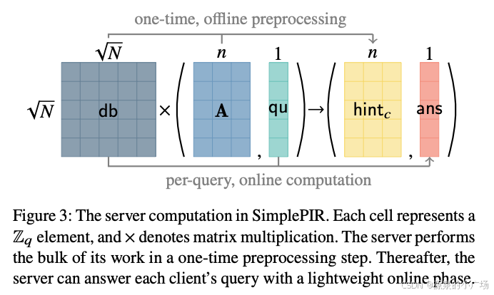 有了上述介绍的背景知识,理解了基于LWE实现的同态特性组件,我们其实基本上能理解SimplePIR所要做的事情了。图7展示了 SimplePIR服务端计算,这里的(A, qu)其实就是公钥, hintc是预处理的计算,ans是服务端处理结果返回给客户端。