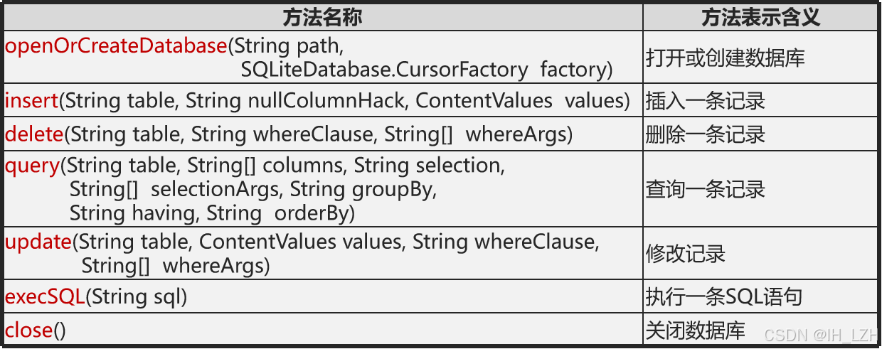 Android中使用SQLiteDatabase代表数据库,并提供了一系列方法来操作数据库。对于常用的增删改查操作,既可以使用execSQL()方法直接执行sql语句,也可以使用Android提供的方法,由于execSQL()方法返回void,无法判断是否执行成功,所以除创建表之外的操作通常使用Android提供的一系列方法。