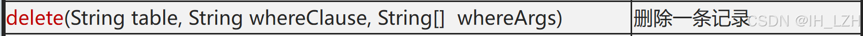 private void delete() { //删除条件 String whereClause = "word = ?"; //删除条件参数 String[] whereArgs = {String.valueOf(words.getWord())}; //执行删除 int row = wordDB.delete("tb_word", whereClause, whereArgs); if(row > 0){ Log.i("delete", "删除成功"); }else { Log.i("delete", "删除失败"); } }