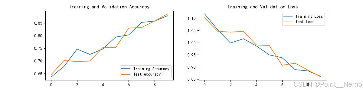 import matplotlib.pyplot as plt # 隐藏警告 import warnings warnings.filterwarnings("ignore") # 忽略警告信息 plt.rcParams['font.sans-serif'] = ['SimHei'] # 用来正常显示中文标签 plt.rcParams['axes.unicode_minus'] = False # 用来正常显示负号 plt.rcParams['figure.dpi'] = 100 # 分辨率 epochs_range = range(epochs) plt.figure(figsize=(12, 3)) plt.subplot(1, 2, 1) plt.plot(epochs_range, train_acc, label='Training Accuracy') plt.plot(epochs_range, test_acc, label='Test Accuracy') plt.legend(loc='lower right') plt.title('Training and Validation Accuracy') plt.subplot(1, 2, 2) plt.plot(epochs_range, train_loss, label='Training Loss') plt.plot(epochs_range, test_loss, label='Test Loss') plt.legend(loc='upper right') plt.title('Training and Validation Loss') plt.show()