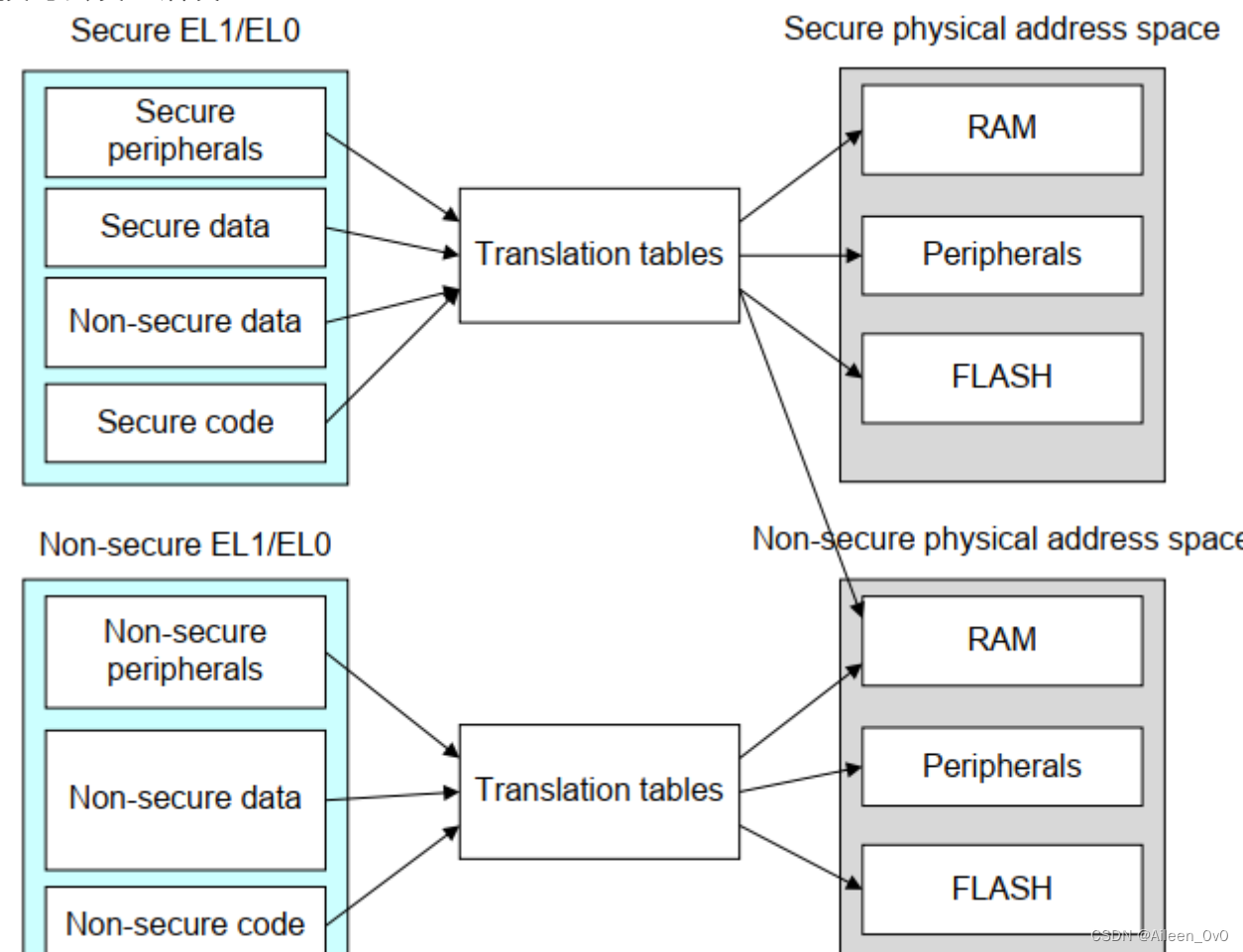 首页,在软件架构的设计中,就分为: Non-secure EL0&1 Transslation Regime 和 Secure EL0&1 Transslation Regime,即normal world和secure world侧使用不同的Transslation Regime;