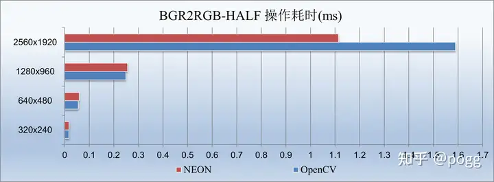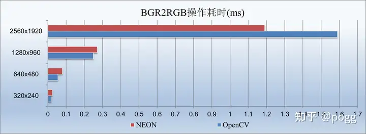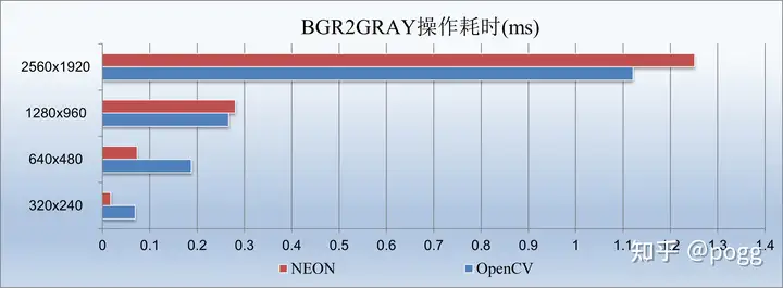 我们看到了与第一小节几乎相反的情况,从1280以下的尺寸开始,neon几乎吊打了OpenCV,我们看下转灰度图和转RGB的区别。由于转灰度图是,通常使用以下公式来计算每个像素的灰度值: