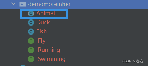 在demomoreinher包中有Animal抽象类,Duck,Fish类 以及IFly、IRunning、ISwimming接口