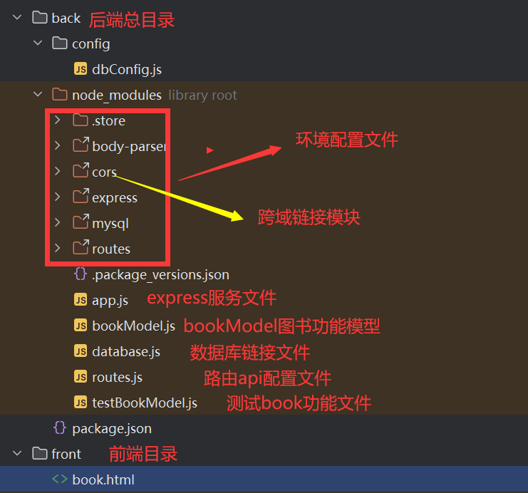 const express = require('express'); const router = express.Router(); const BookModel = require('bookModel'); // 确保此路径正确指向您的模型文件GET http://localhost:3000/api/books // 功能1:显示所有书籍数据 router.get('/books', async (req, res) => { try { const books = await BookModel.getAllBooks(); res.json(books); } catch (err) { res.status(500).json({ message: 'Error retrieving books', error: err.message }); } }); // 功能2:输入指定作者,查询书籍 router.get('/books', async (req, res) => { try { const author = req.query.author; // 从查询参数中获取作者 const booksByAuthor = await BookModel.getBooksByAuthor(author); res.json(booksByAuthor); } catch (err) { res.status(500).json({ message: 'Error retrieving books by author', error: err.message }); } }); // 功能3:输入指定id,删除书籍 router.delete('/books/:id', async (req, res) => { try { const bookId = req.params.id; await BookModel.deleteBookById(bookId); res.status(204).end(); } catch (err) { res.status(500).json({ message: 'Error deleting book', error: err.message }); } }); // 功能4:输入指定id,修改书籍信息 router.put('/books/:id', async (req, res) => { try { const bookId = req.params.id; const updateData = req.body; // 获取请求体中的书籍信息 await BookModel.updateBookById(bookId, updateData); res.status(200).json({ message: 'Book updated successfully' }); } catch (err) { res.status(500).json({ message: 'Error updating book', error: err.message }); } }); // 功能5:输入图书信息,增加图书 router.post('/books', async (req, res) => { try { const newBook = req.body; // 获取请求体中的书籍信息 await BookModel.addBook(newBook); res.status(201).json({ message: 'Book added successfully' }); } catch (err) { res.status(500).json({ message: 'Error adding book', error: err.message }); } }); module.exports = router; /*mysql> CREATE TABLE books ( -> id INT AUTO_INCREMENT PRIMARY KEY, -> name VARCHAR(255) NOT NULL, -> author VARCHAR(255) NOT NULL, -> price DECIMAL(10, 2) NOT NULL, -> publisher VARCHAR(255) NOT NULL -> );*/