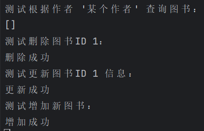 实现了RESTful API,包括获取所有图书、根据作者查询图书、删除指定ID的图书、更新指定ID的图书信息、增加新图书。