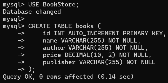 设计了books表,包含字段:id, name, author, price, publisher。