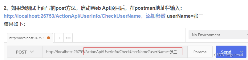 2、如果想测试上面写的post方法,启动Web Api项目后,在postman地址栏输入:http://localhost:26753/ActionApi/UserInfo/CheckUserName,添加参数 userName=张三
