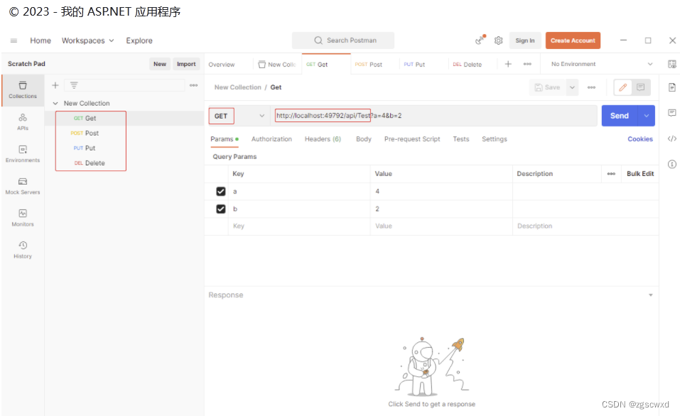 [HttpPost] public string demo([FromBody] Contact name) { string nn = name.Name; string result = string.Empty; result = "您的参数是:" + nn; return result; } [HttpGet] public string wxs(string name) { string result = string.Empty; result = "{Name:\"" + name + "\"}"; return result; }