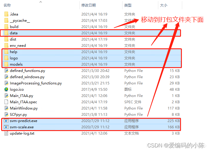 下面是打包完成的程序,一般该程序打包完成后,软件内部的我们自己建立的文件夹和python程序调用的程序需要放到打包好的程序文件下面才能运行,否则程序运行过程中容易出现错误,具体需要移动的文件及文件夹如下: