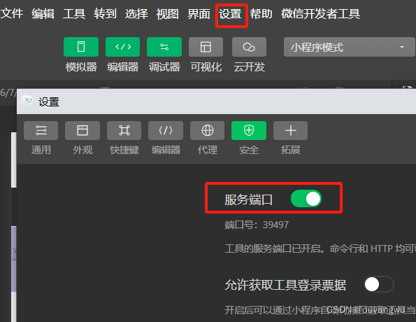 微信开发者工具中 设置->安全设置 打开服务端口: