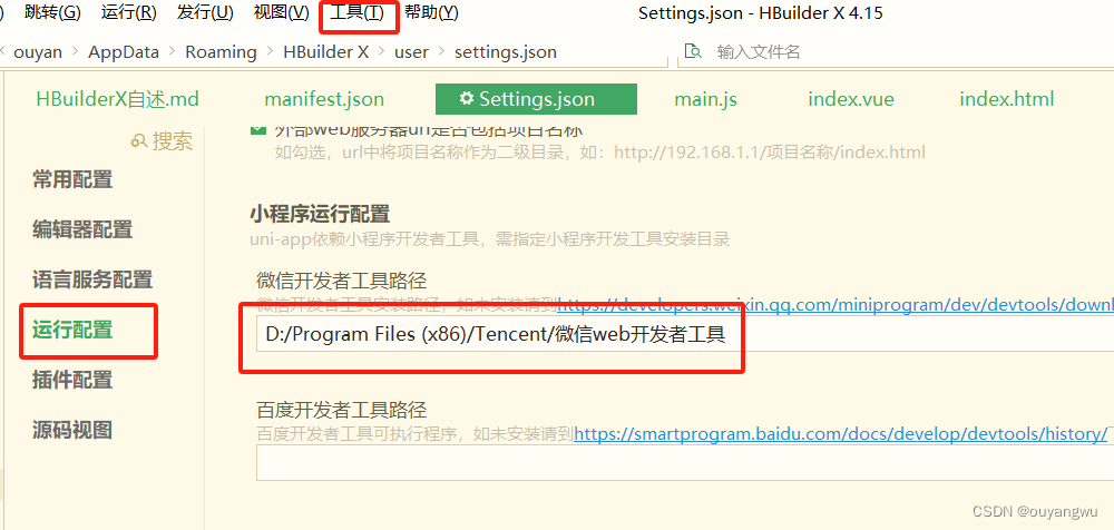 在HBuilderX中 工具->设置->运行设置中配置 微信开发者工具 的安装地址。