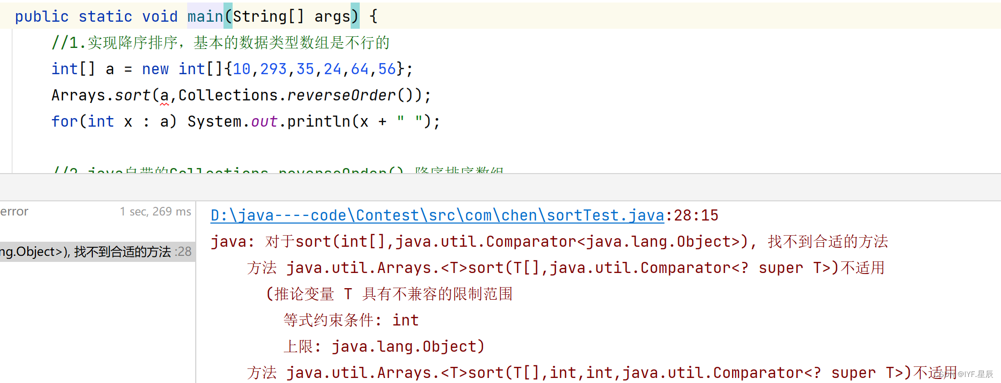 //2.java自带的Collections.reverseOrder() 降序排序数组 System.out.println("java自带的Collections.reverseOrder():"); Integer[] integers = new Integer[]{10, 293, 35, 24, 64, 56}; Arrays.sort(integers, Collections.reverseOrder()); for (Integer integer : integers) System.out.print(integer + " ");