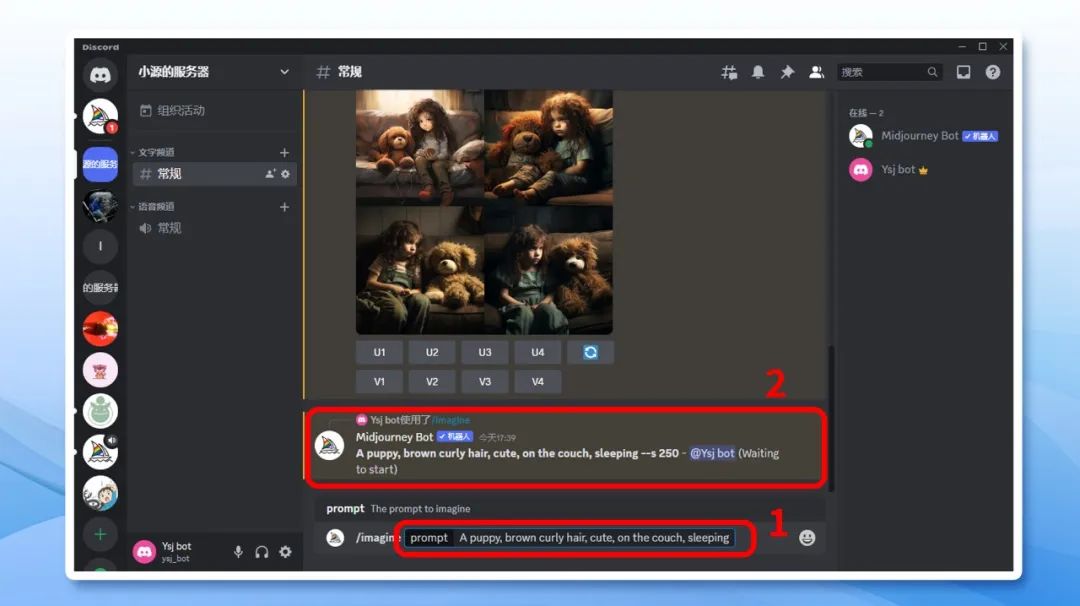 在MJ中,所有操作都是通过指令模块实现的。想要画图,就得输入生成指令。进入个人服务器页面,点击右侧联系人栏的「Midjourney Bot 机器人」,选择/imagine指令。