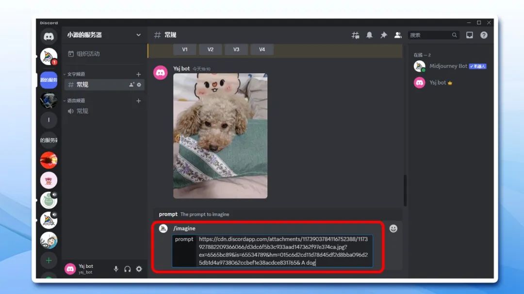 同样输入/imagine指令,在「Prompt」后面粘贴刚刚复制过来的链接。MJ中的图生图无法完全只靠一张图完成,还_需要搭配文本提示词_。要强调的是,在粘贴完链接后,需要打一个空格,才能继续输入文本提示词哦。