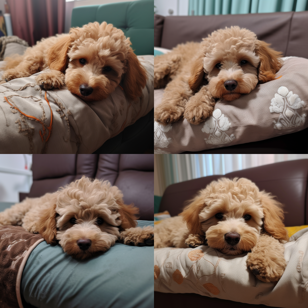 让我们分别输入“A dog”一个提示词和刚刚的“A puppy, brown curly hair, cute, on the couch, sleeping”一组提示词,搭配上传的例图来对比看看。