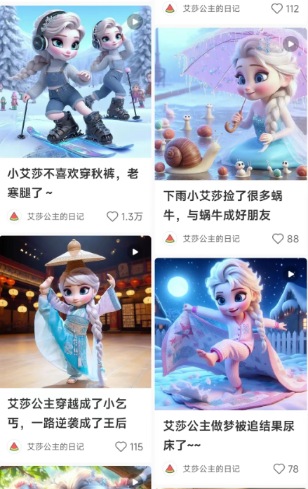 另外一种是结合热门卡通动漫形象,去开发更多的童话故事,衍生周边商品。下面的账号是以艾莎公主的形象制作的儿童故事短片,制作逻辑和上面的账号一致,都是一套提示词,然后换不同场景,不同的故事画面去生产内容。