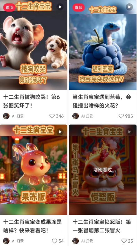 我举个例子,AI绘画找一个关键词,然后做12生肖的AI绘画,然后把这种图连起来做小视频,一套提示词就可以快速起号了,而且起号速度非常快,下面这个对标账号20个内容轻松涨粉1000+。