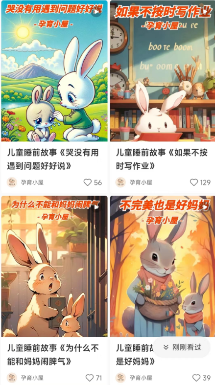 父母会愿意让孩子去看这类小动画,孩子会愿意看这种画面精美的小故事,而且这种内容完全可以制作成故事实体书,然后开小红书店铺去售卖电子资料也可以。
