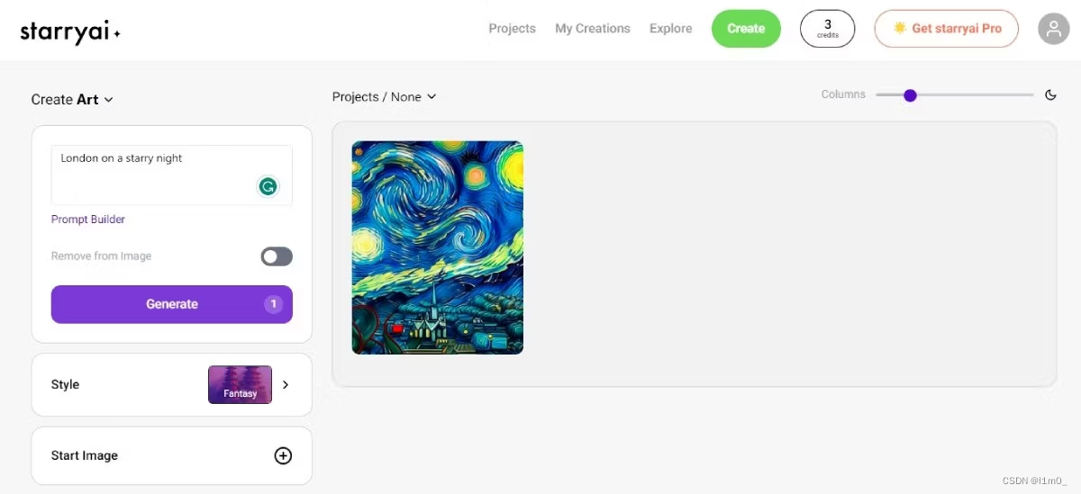 Starry AI是一款具有精细控制的文生图功能的AI绘画免费软件,与许多其他产品不同,它提供了对某些方面的精细控制,使结果更加个性化。你需要首先选择 AI 图像类型:艺术或照片。生成Art,接着输入提示,选择Styles、Canvas Size和Runtime,最后等待新的图像产生。