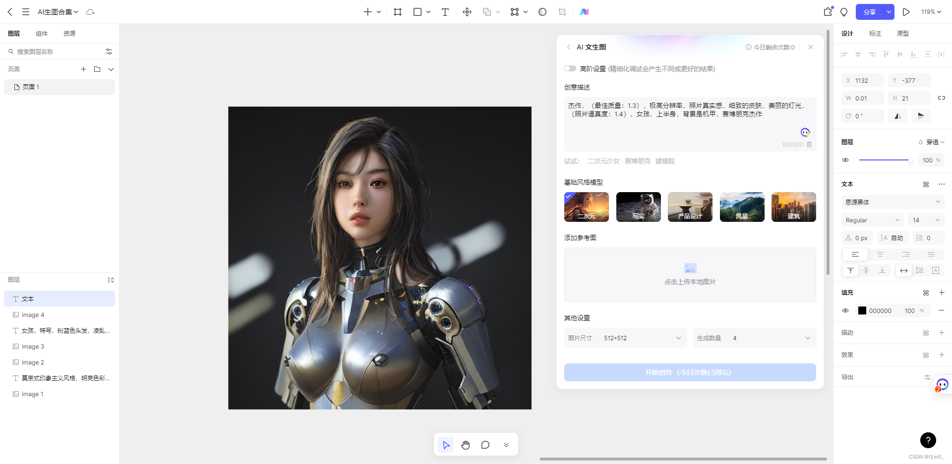 创意激发:Pixso AI文本生成图像功能不仅可以用于快速生成具体的设计元素,还可以用于创意的探索和激发。设计师可以使用简单的文本描述来表达想法,AI 系统会生成相应的图像,为设计师提供新颖的创意视角和可能性。