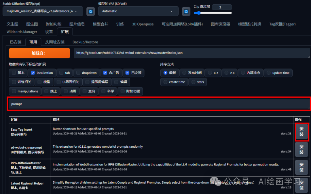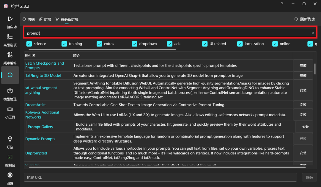 setp3 点击安装新扩展,搜索插件名词,回车。如:prompt