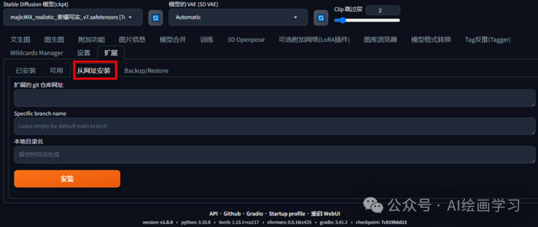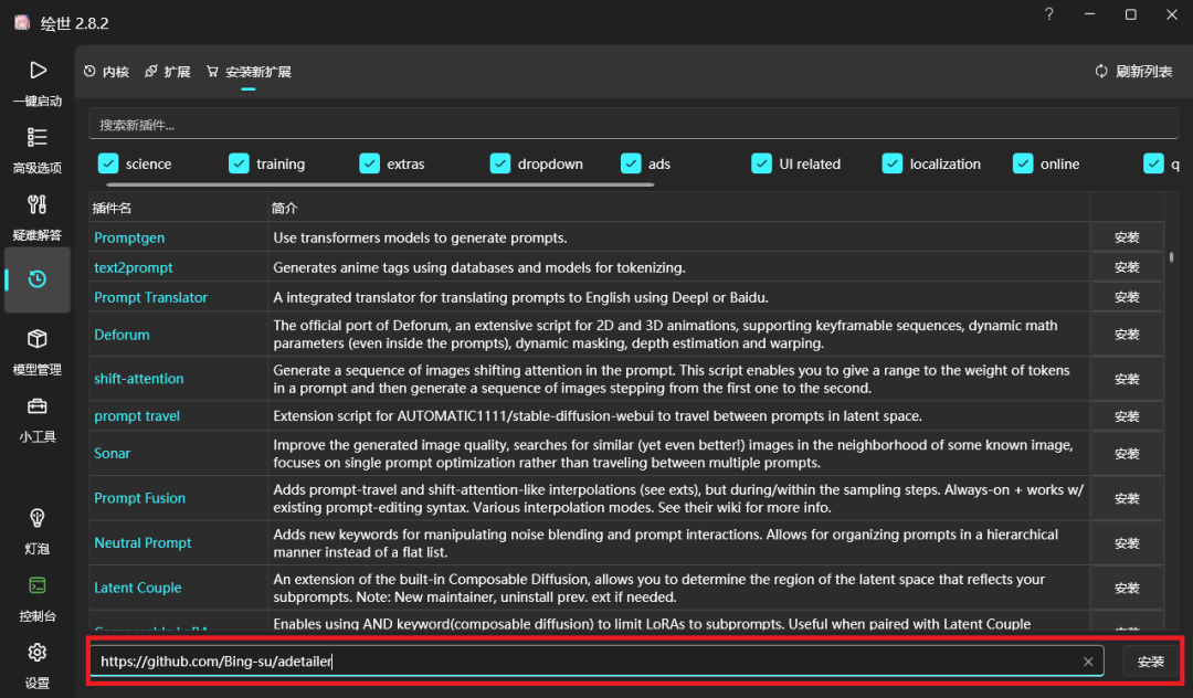如果你已经“一键启动”了webUI,也可以在webUI安装,只不过需要重新启动下才能生效。