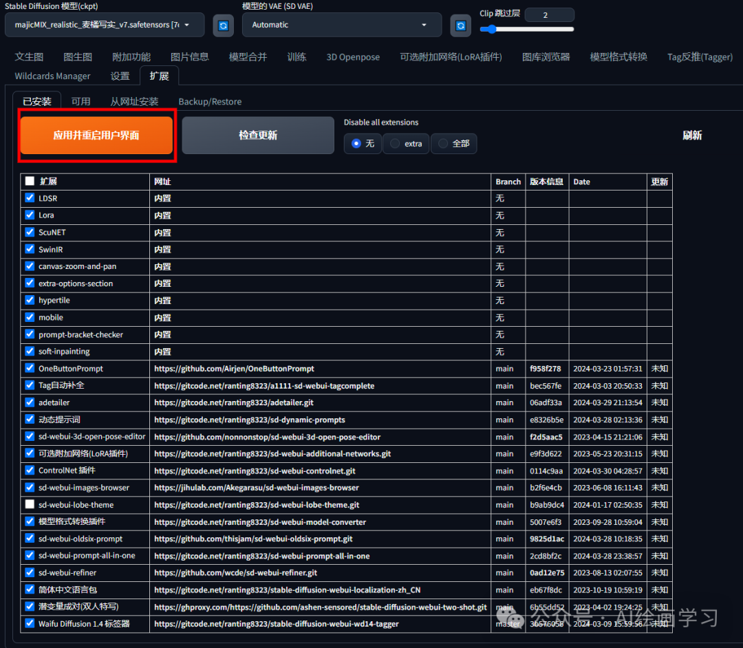 在安装最新版@秋叶的SD webUI安装包(若无安装包请看往期Stable Diffusion安装教程&安装包),已经内置了必要的插件如下: