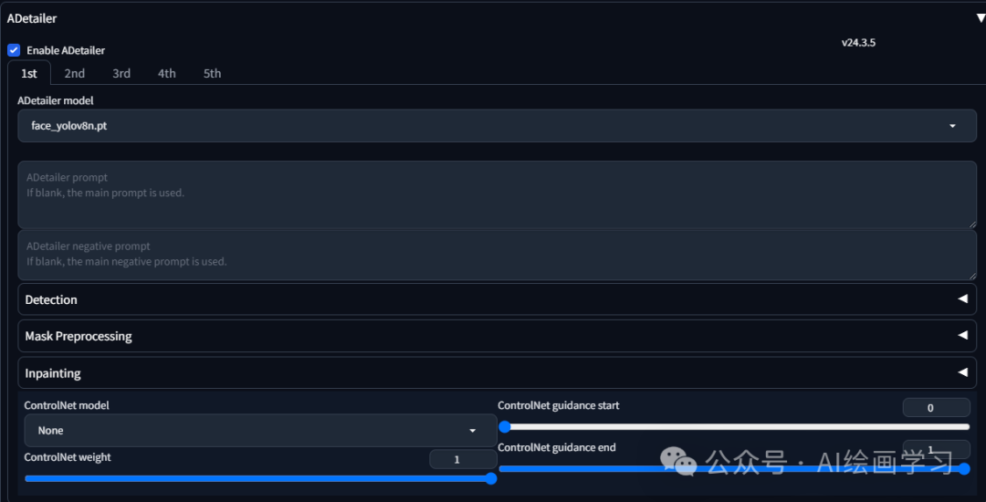 插件用途:图片修复插件(包括:身体 脸 手),支持同时修复所有人的脸,所有人的手灯多个地方。里面包含很多算法,挨个使用的时候会自动下载安装,如果你网络不行请直接下载算法模型,放在文件夹里面“.\novelai-webui-aki-v3\models\adetailer”