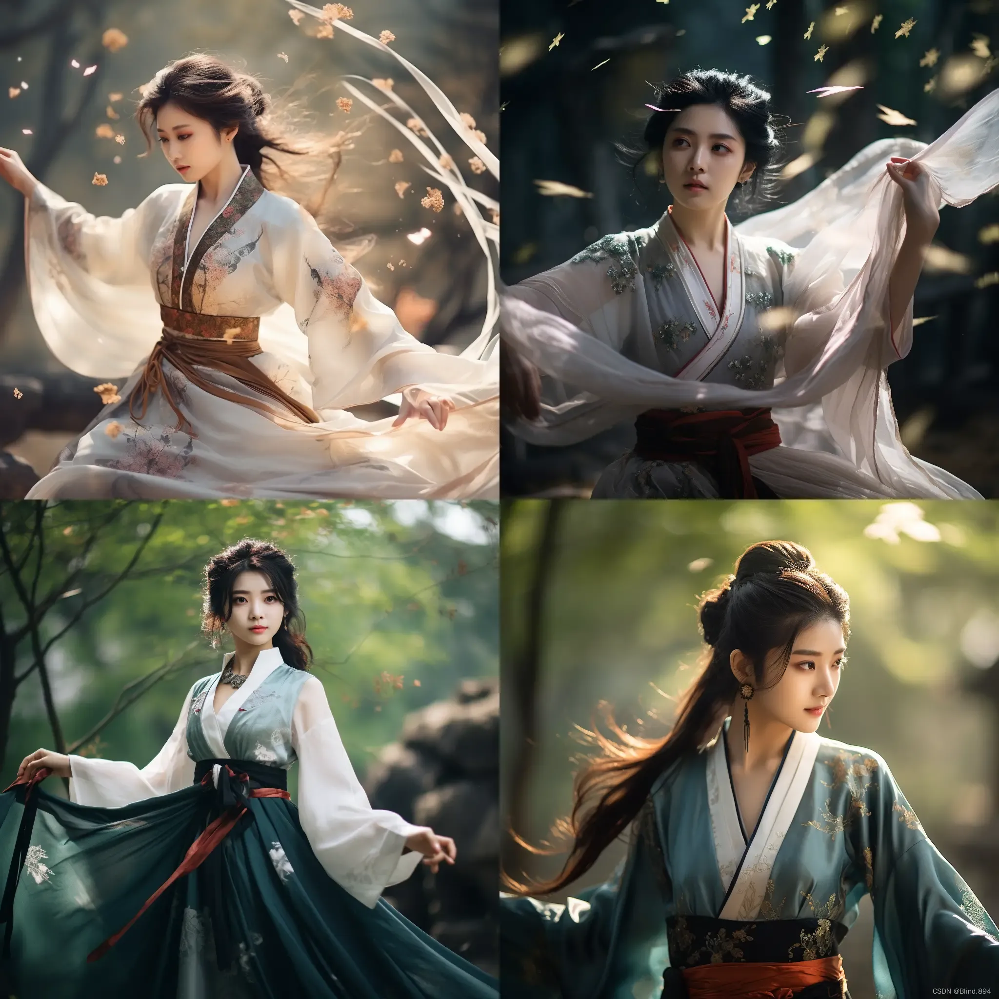 一个中国女孩,童话主题,飘带升起,营造强烈的运动感,中国风,衣服上的金属印花,汉服,精致的身材,美丽的外表,在森林中飞翔,东方面孔,动画,拍摄,富士胶片