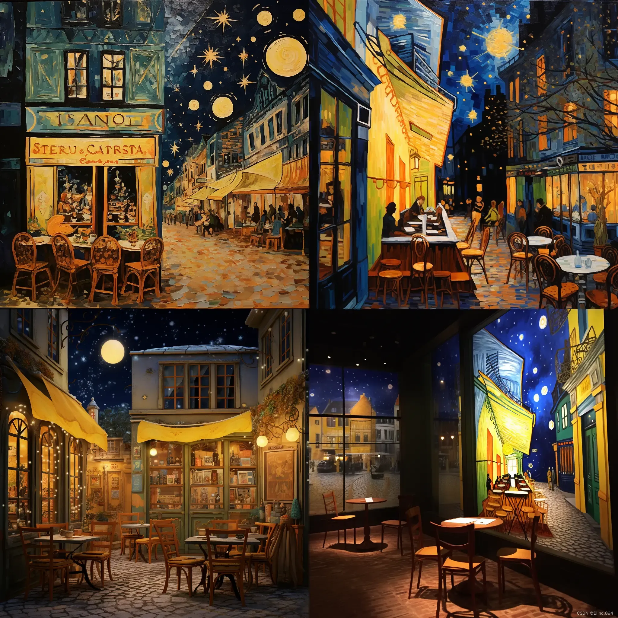英文:The leisurely café, in a Vincent van Gogh's starry night scene: a Parisian street café, with the starry night twinkling, van Gogh-style starry sky adorning the café windows, warm yellow lights