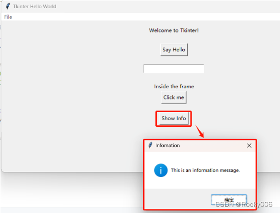# ... from tkinter import messagebox def show_info(): messagebox.showinfo("Information", "This is an information message.") # ... # Create a button to show the information dialog info_button = tk.Button(root, text="Show Info", command=show_info) info_button.pack(pady=10) # ...