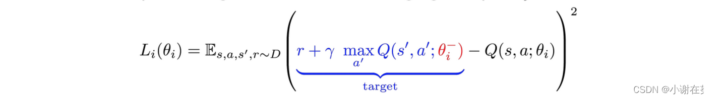 如果不能很好的理解,请看下面公式,下面公式中target是什么我们会在后面说到,这里先忽略它,那个红色的 θi- 我们也暂且将它当成 θi来看这个公式描述的就是模型的损失函数,大括号外面就是求一个均方差,我们主要看括号里面。前面被target标出来的地方是这一步得到的reward+下一状态所能得到的最大Q值,它们减去这一步的Q值,那么实际上它们的差就是实际reward减去现有模型认为在s下采取a时能得到的reward值。