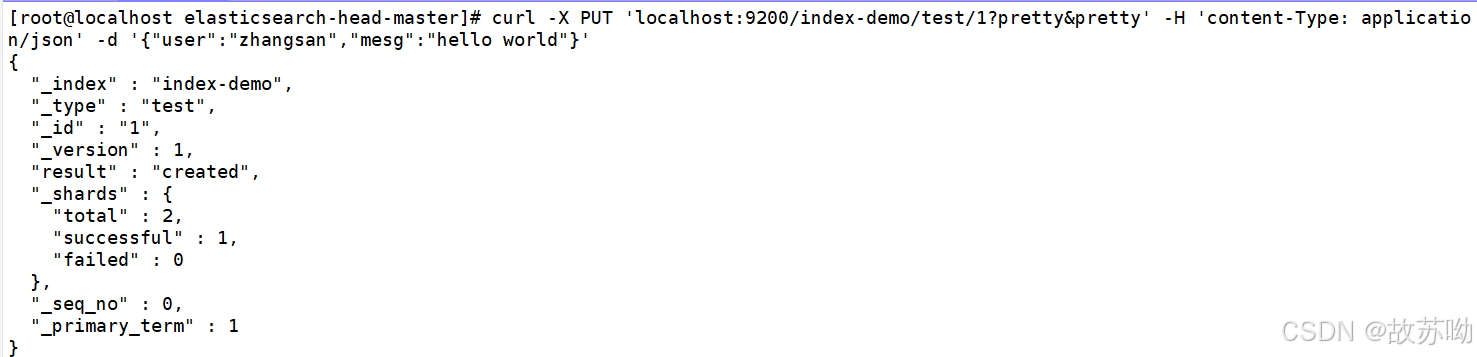 curl -X PUT 'localhost:9200/index-demo/test/1?pretty&pretty' -H 'content-Type: application/json' -d '{"user":"zhangsan","mesg":"hello world"}'