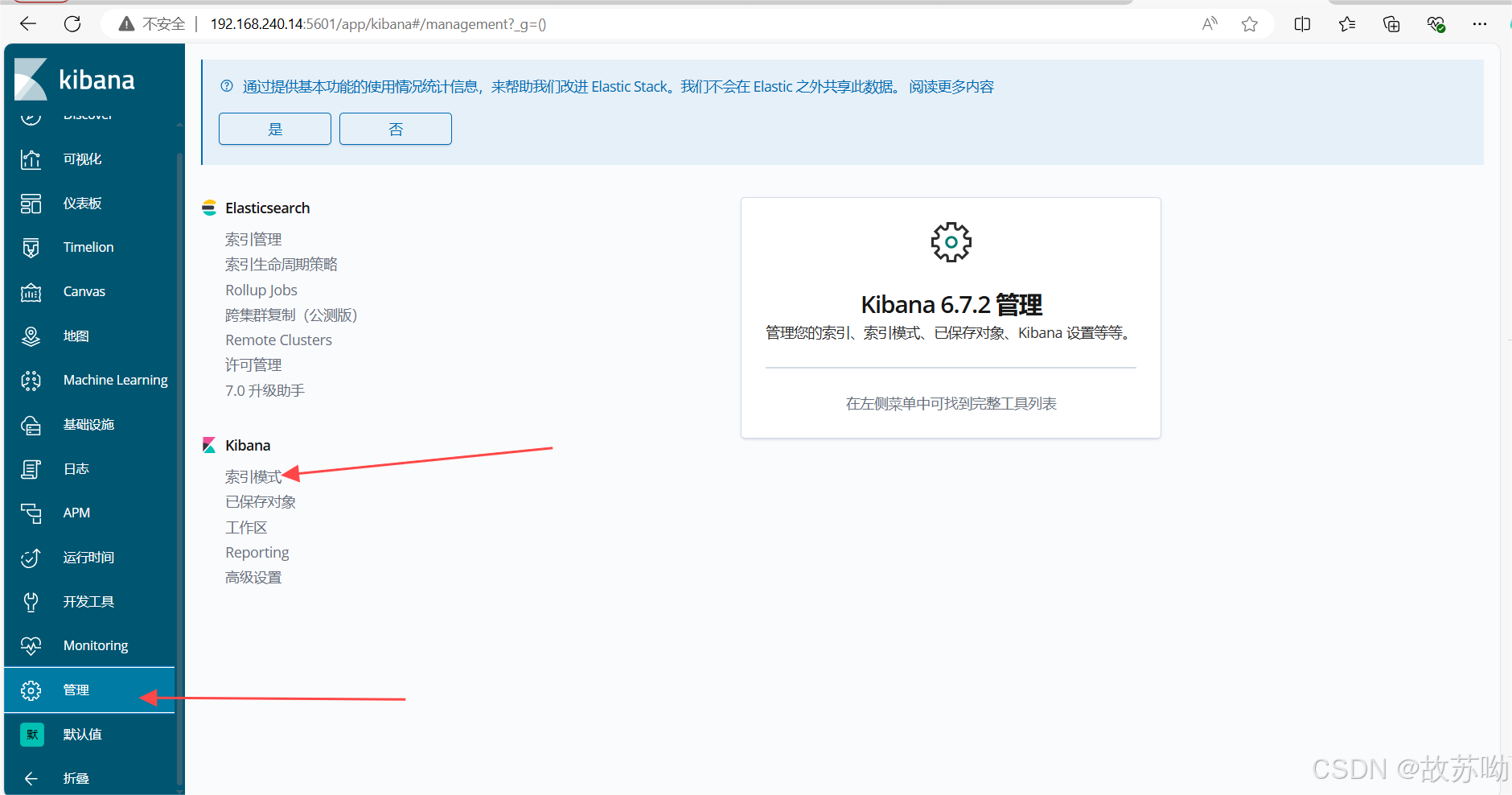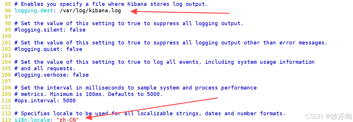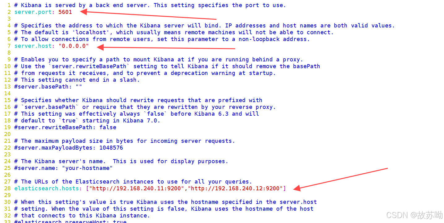 [root@localhost data]# cd /etc/kibana/ [root@localhost kibana]# cp kibana.yml kibana.yml.bak -a [root@localhost kibana]# vim kibana.yml 2 server.port: 5601 #打开端口 7 server.host: "0.0.0.0" #监听端口 28 elasticsearch.hosts: ["http://192.168.240.11:9200", "http://192.168.240.12:9200"] #el服务器地址 37 kibana.index: ".kibana" #打开索引 96 logging.dest: /var/log/k.log #指定日志文件, 需要手动建立文件 113 i18n.locale: "zh-CN" #中文设置 touch /var/log/kibana.log [root@localhost kibana]# chown kibana:kibana /var/log/k.log
