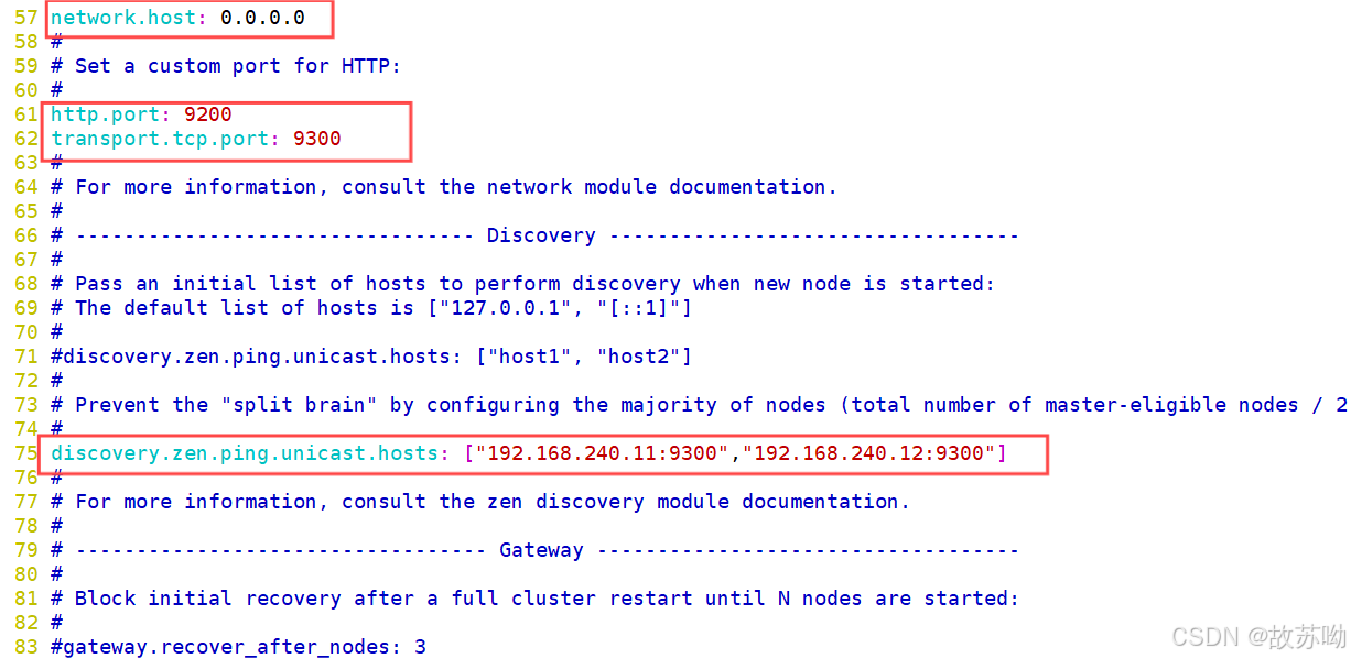 scp -r /etc/elasticsearch/elasticsearch.yml 192.168.240.12:/etc/elasticsearch/ #需要注意的是传输完成后需要将配置文件中的 23 node.name: node1 修改为node2