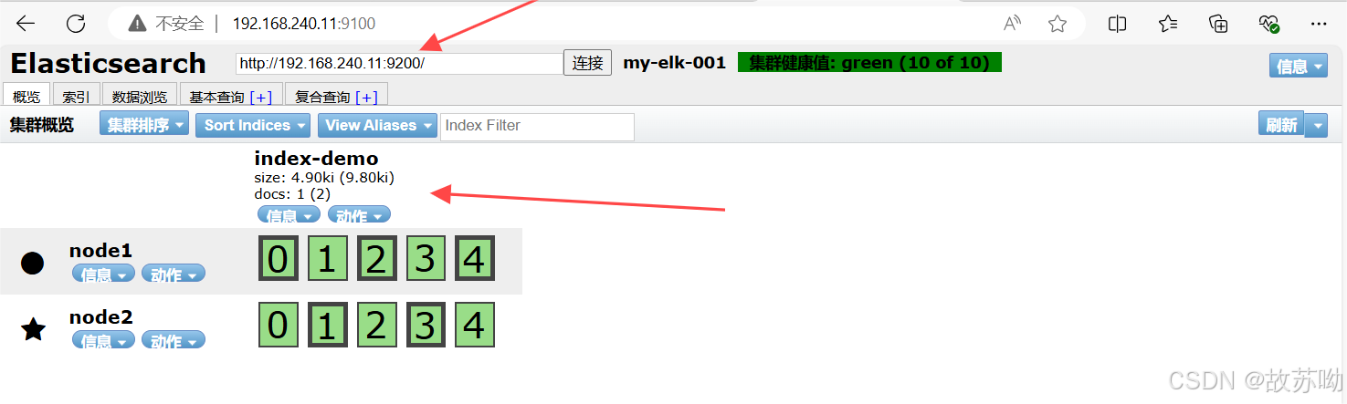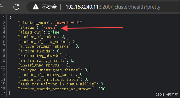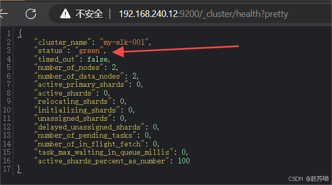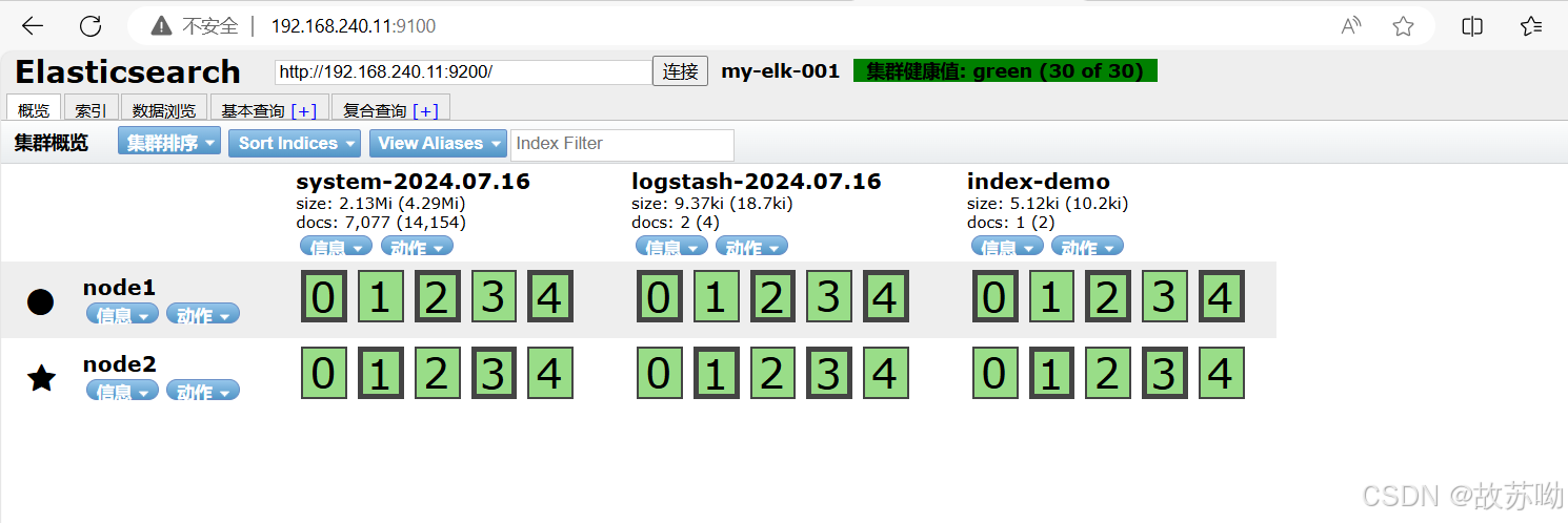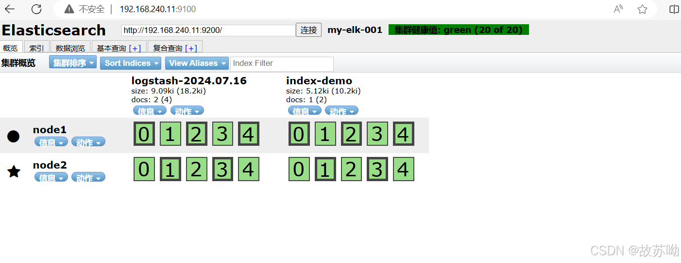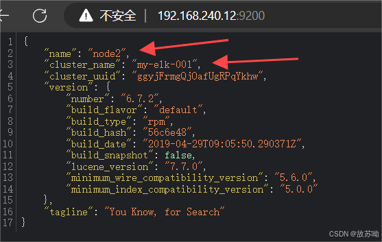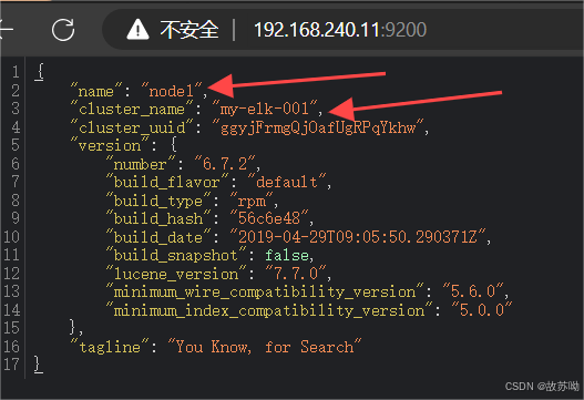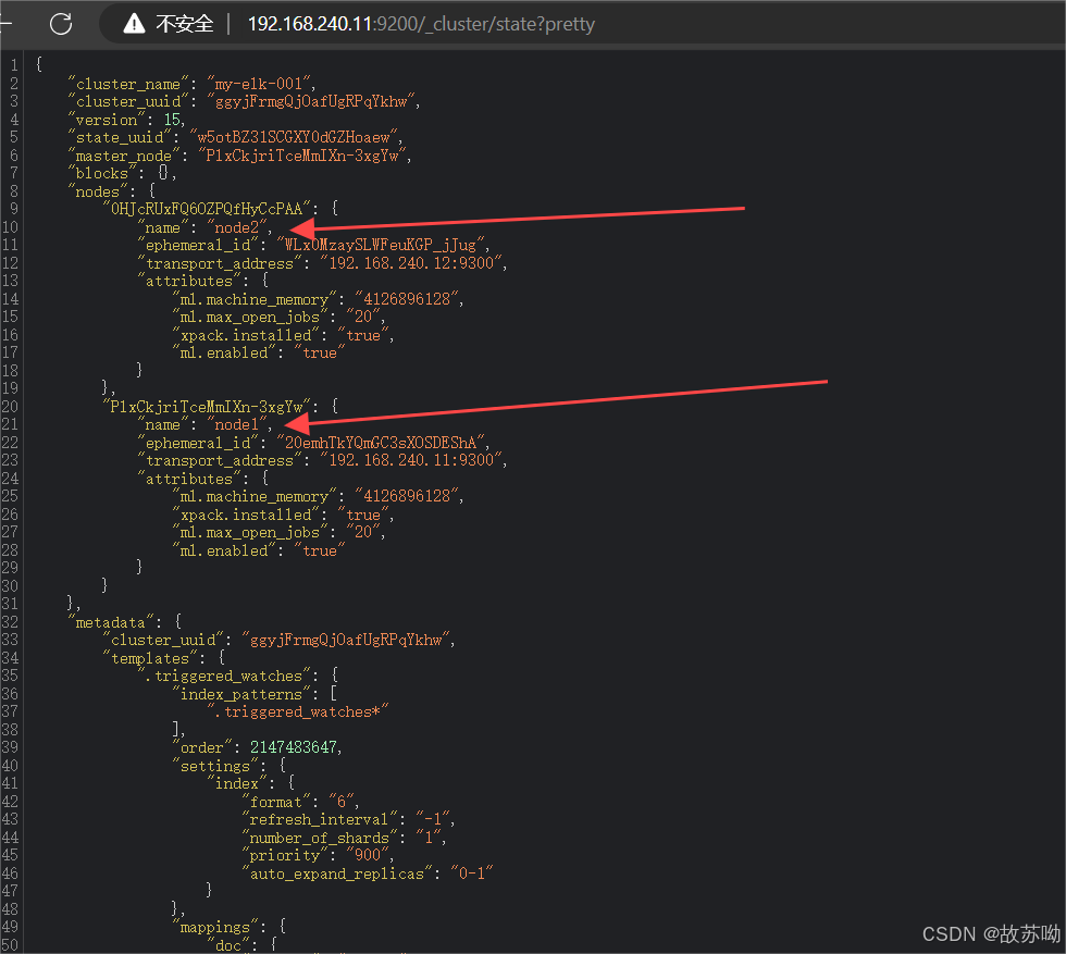 浏览器访问 http://192.168.240.11:9200 http://192.168.240.12:9200 查看节点 Node1、Node2 的信息。 浏览器访问 http://192.168.240.11:9200/_cluster/health?pretty http://192.168.240.12:9200/_cluster/health?pretty 查看群集的健康情况,可以看到 status 值为 green(绿色), 表示节点健康运行。 浏览器访问 http://192.168.240.11:9200/_cluster/state?pretty 检查群集状态信息