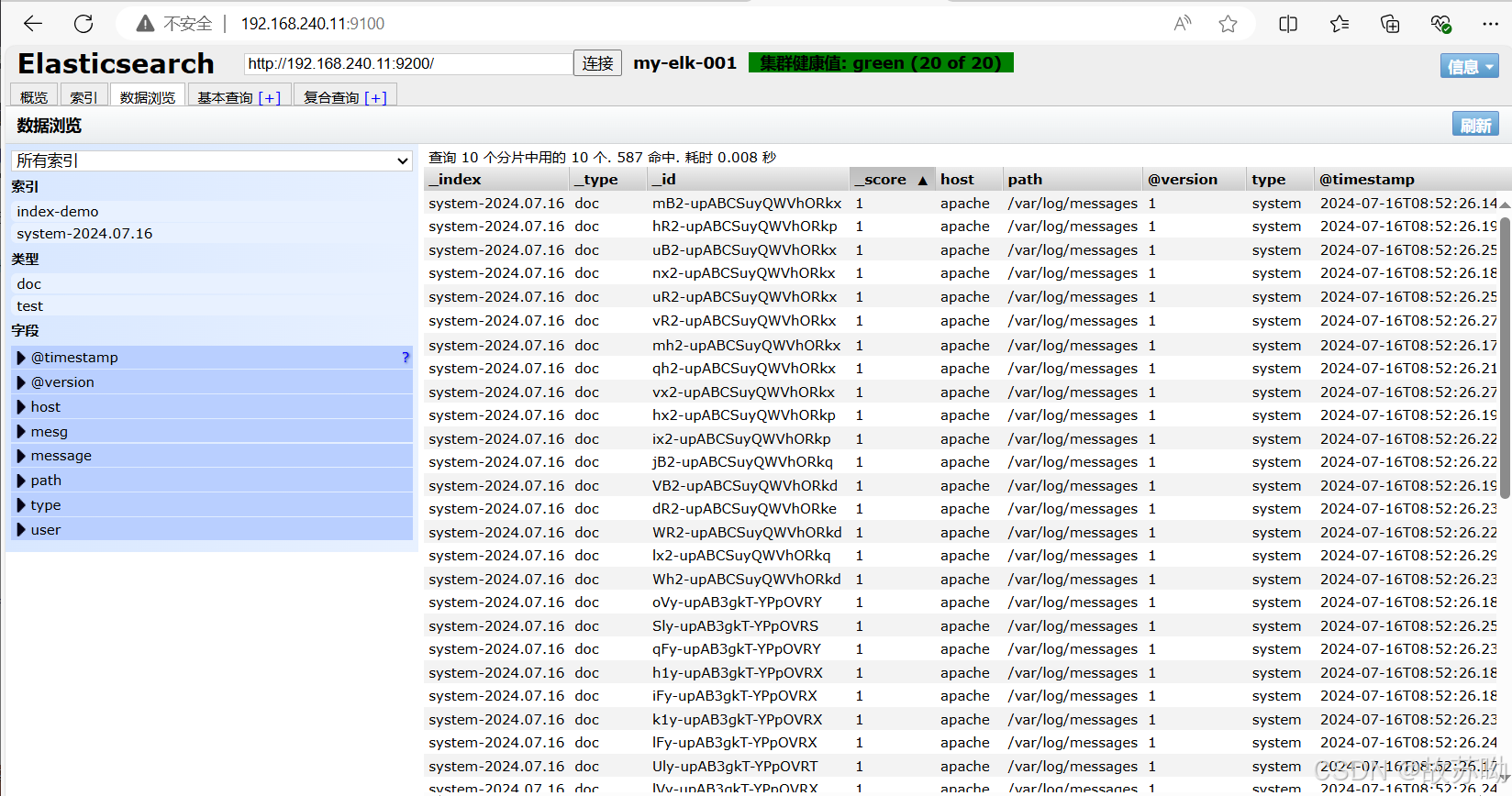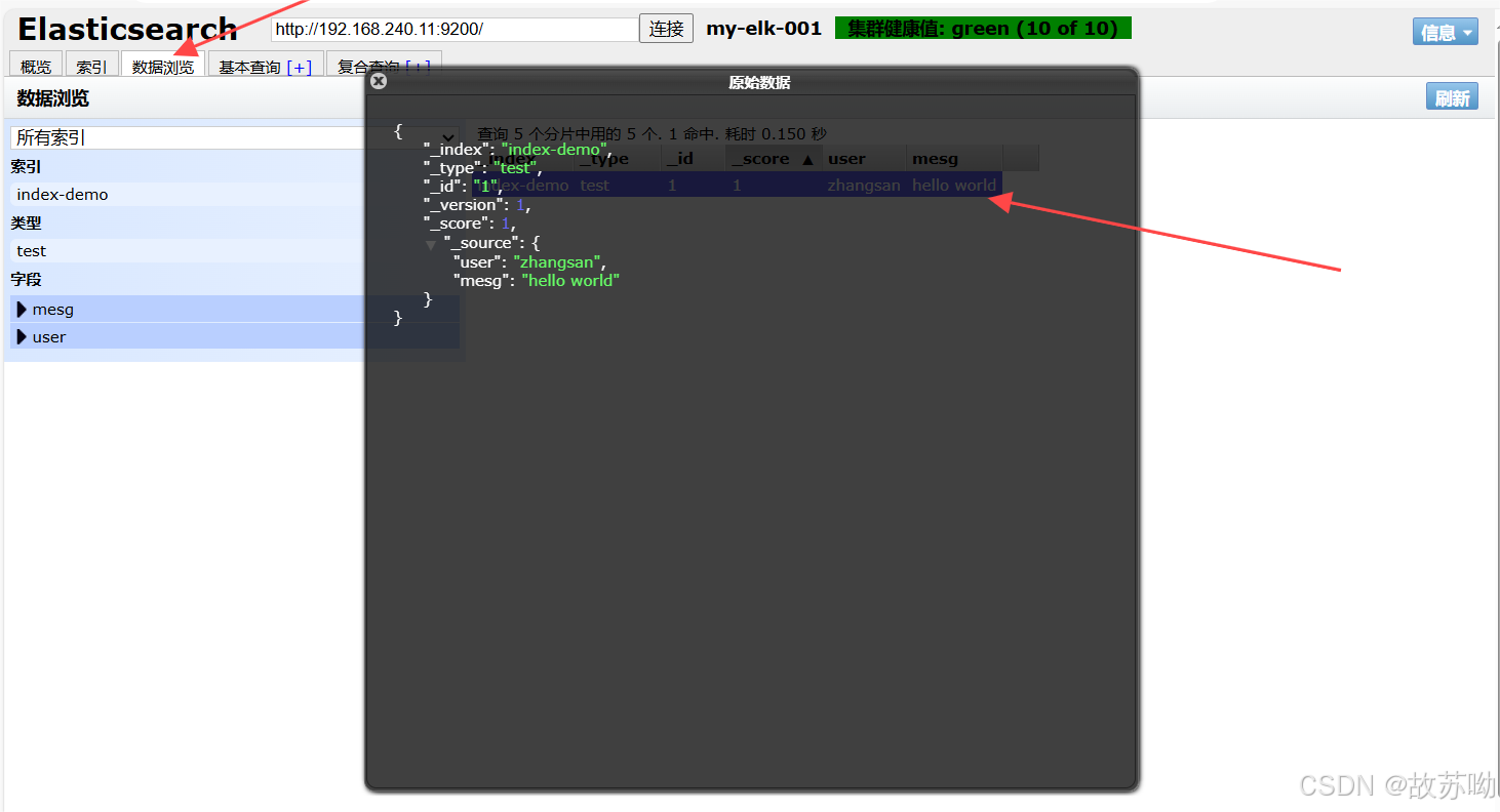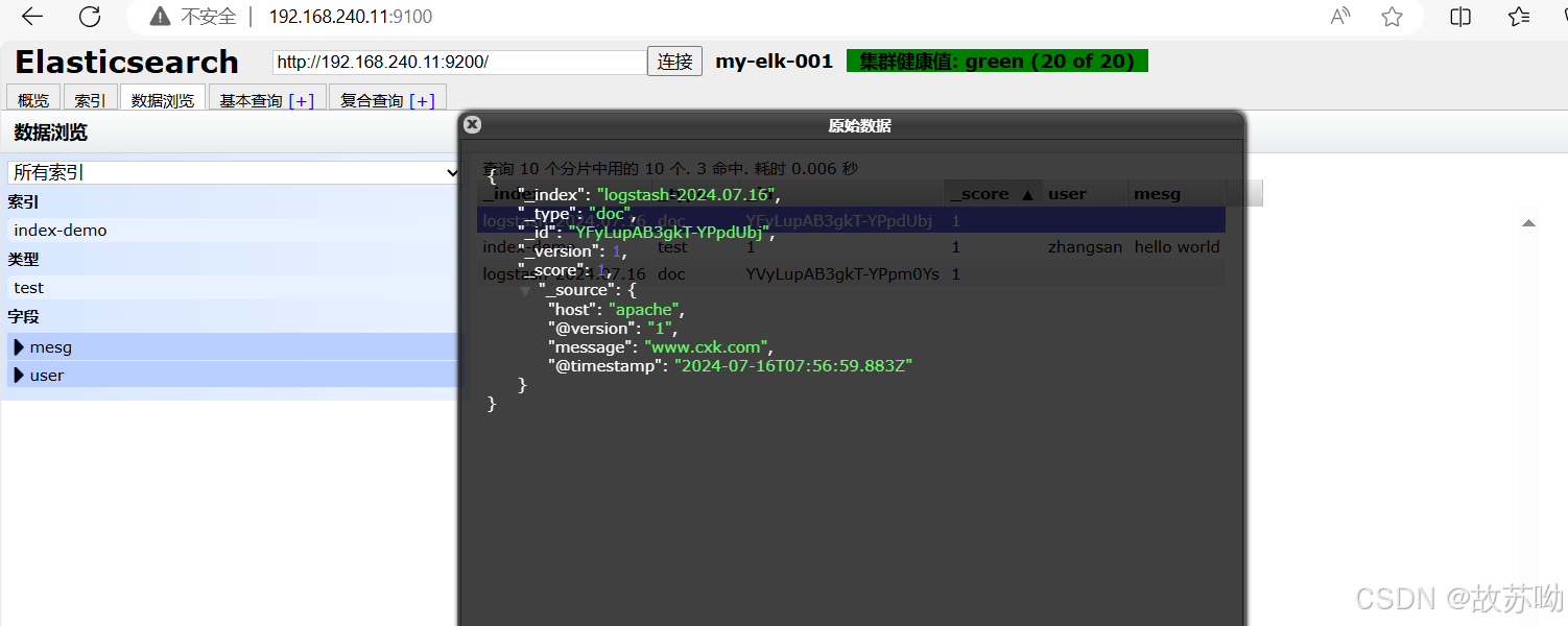 浏览器访问 http://192.168.240.11:9200 http://192.168.240.12:9200 查看节点 Node1、Node2 的信息。 浏览器访问 http://192.168.240.11:9200/_cluster/health?pretty http://192.168.240.12:9200/_cluster/health?pretty 查看群集的健康情况,可以看到 status 值为 green(绿色), 表示节点健康运行。 浏览器访问 http://192.168.240.11:9200/_cluster/state?pretty 检查群集状态信息