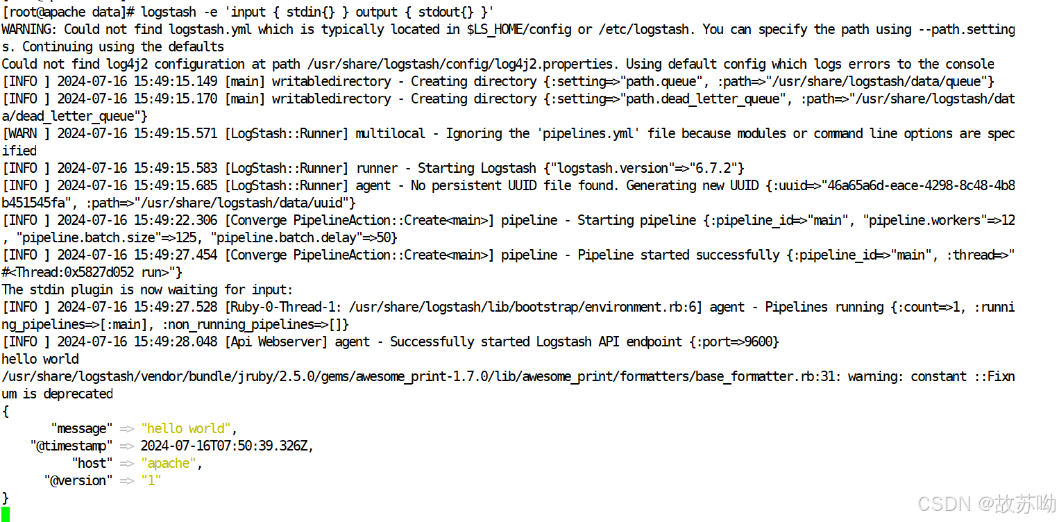 logstash -e 'input { stdin{} } output { stdout{} }' # 此处输入需要的信息 hello world { "message" => "hello world", "@timestamp" => 2024-07-16T07:50:39.326Z, "host" => "apache", "@version" => "1" }