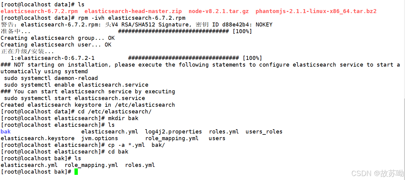 [root@localhost data]# ls elasticsearch-6.7.2.rpm elasticsearch-head-master.zip node-v8.2.1.tar.gz phantomjs-2.1.1-linux-x86_64.tar.bz2 [root@localhost data]# rpm -ivh elasticsearch-6.7.2.rpm cd /etc/elasticsearch/ mkdir bak cp -a *.yml bak/ #备份